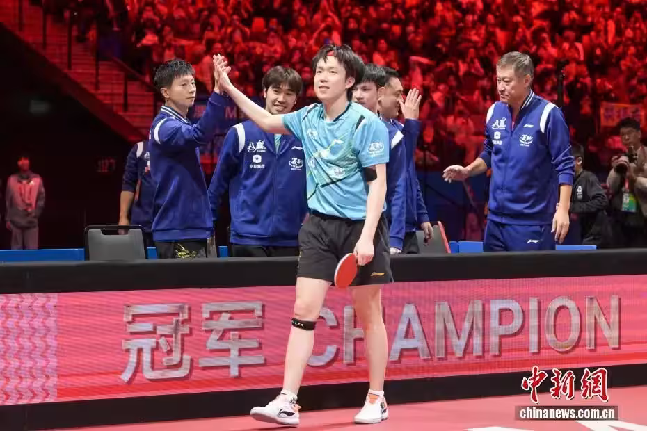 11月20日,第十五屆全國運動會桌球成年組男子團體金牌賽在澳門銀河綜藝館舉行。馬龍、王楚欽帶領的北京隊以3:1戰勝樊振東帶領的上海隊,奪得金牌。圖為北京隊選手馬龍(左一)與王楚欽擊掌慶祝