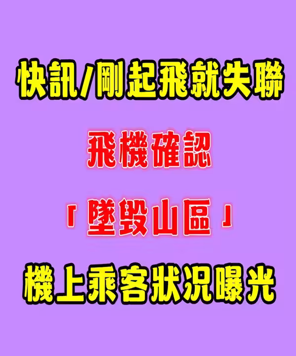 快訊 / 剛起飛就失聯!飛機確認「墜毀山區」機上「乘客狀況曝光」