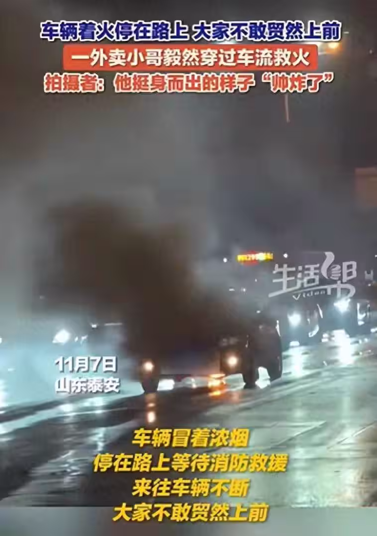 11月7號中午,泰安某商場附近一輛車突然起火,外賣小哥看見後跑去警務室借了兩個滅火器去幫忙滅火。