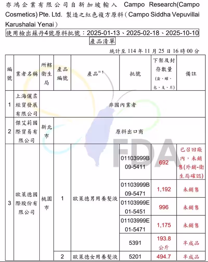 食藥署副署長王德原強調,將持續與地方衛生局共同督導,確保市面上無違規產品流通。也提醒所有化妝品製造及輸入業者,全盤檢視供應鏈來源,確認是否曾使用涉事紅色復方原料,並加強原料來源查核與自主檢驗。