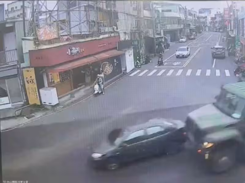 再看一次畫面,駕駛軍用大卡車的25歲蘇姓男子,與開汽車的65歲柯姓男子,再發生交通事故之前,原本在不同車道,不過雙方疑似都想在通過路口後開內車道,加上軍用卡車車身比較高,疑似視線死角沒有注意到因此釀禍,所幸雙方都沒有受傷。台南警永康分局副分局長楊富仁:「影片中軍用大卡車與自小客車發生交通事故,無人受傷肇事責任尚待釐清。」