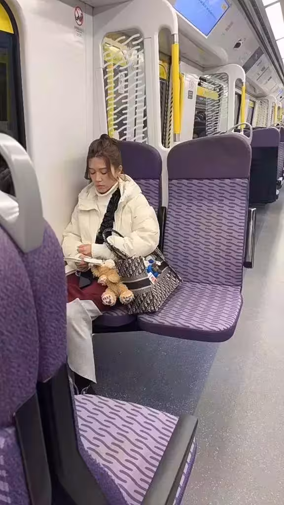照片中,她靜靜地坐在車廂內,神情專注,手中捧著一本筆記本,似乎在溫習或記錄一些工作上的要點。