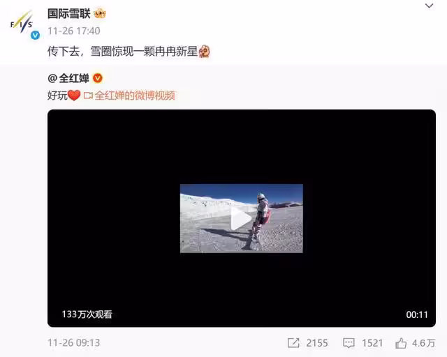 全紅嬋發滑雪視頻,從摔跤到絲滑換刃僅用3天,蘇翊鳴誇讚:非常有天賦,有機會可以一起滑雪!