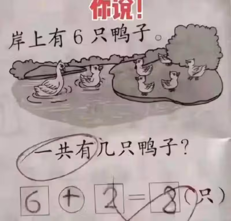 所以正確答案應該是「6+1=7」。 聽完繃瞬間就不住了,回家便數落兒子:「讓你玩手機,連鴨子和鵝都分不清了!」
