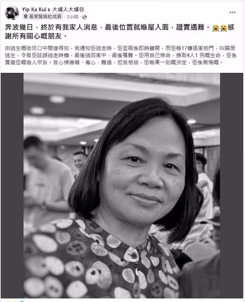 用生命救下4人1狗!香港大火女子逐戶拍門不幸罹難 家屬淚崩:她無悔