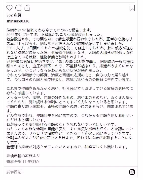 首先在宣告中表示,他仍努力「活著」,懇請所有粉絲、讀者及支持者持續為他祈禱,盼有朝一日他能夠甦醒過來,重新握起畫筆創作新的作品。