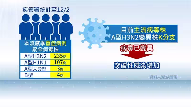 中國附醫副院長黃高彬提到,新的變異株有七個突變點,也就是說病毒不太一樣,流感疫苗預防的效果就不是很好,但是對重症來講是有效的。