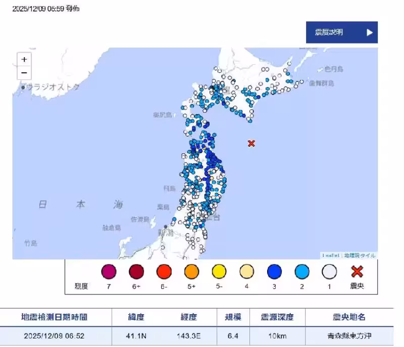 日本青森縣東方外海於當地時間9日上午6時52分再度發生規模6.4地震,震源深度僅10公里,屬於極淺層地震。