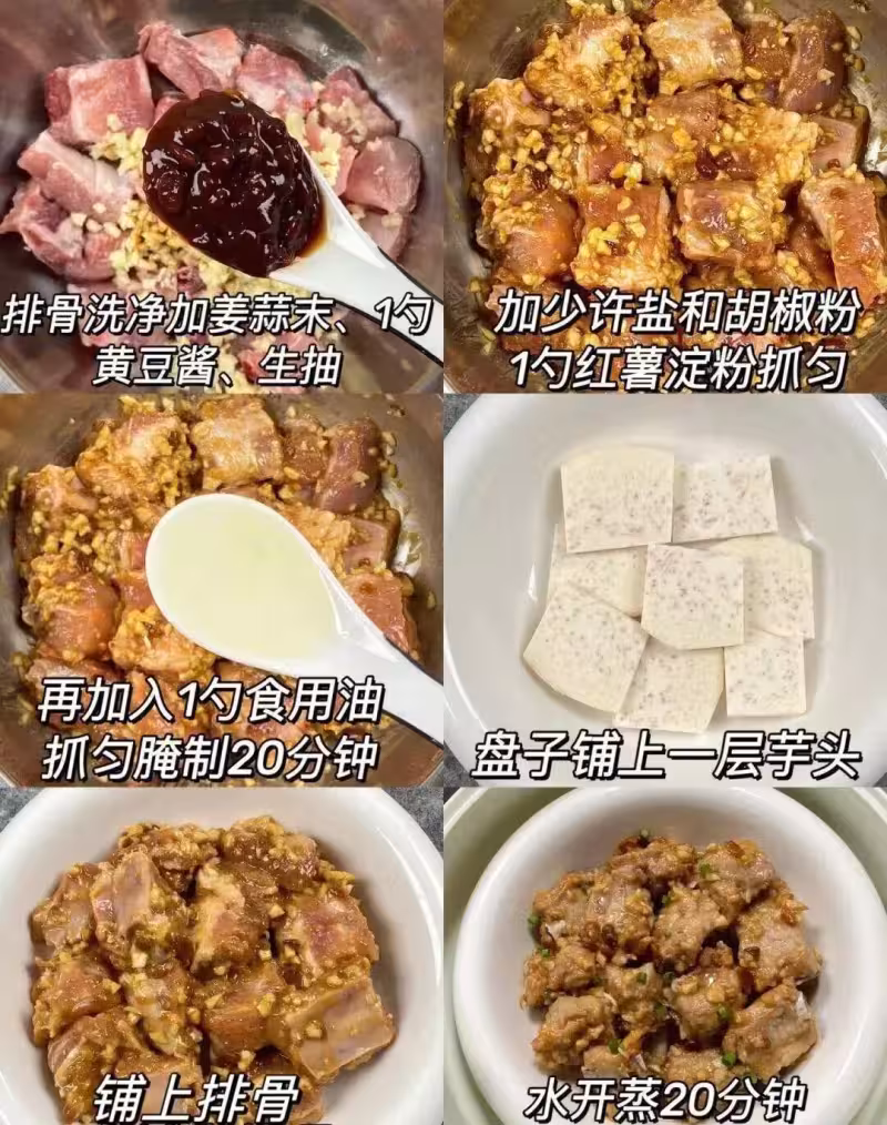 1. 排骨洗凈,加蒜末、薑末、黃豆醬1勺、生抽1勺、澱粉1勺抓勻,腌制20分鐘。