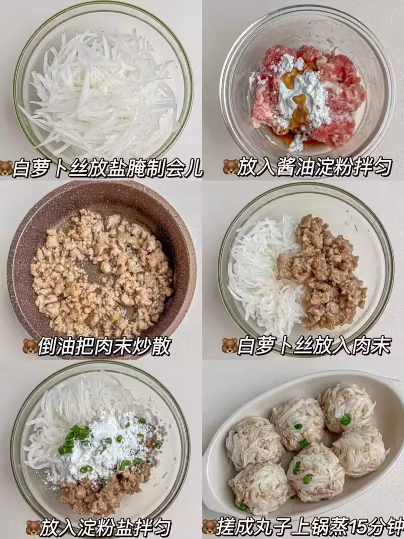 2. 肉末加醬油、澱粉拌勻,與蘿蔔絲混合搓成丸子,水開上鍋,蒸15分鐘至熟透。