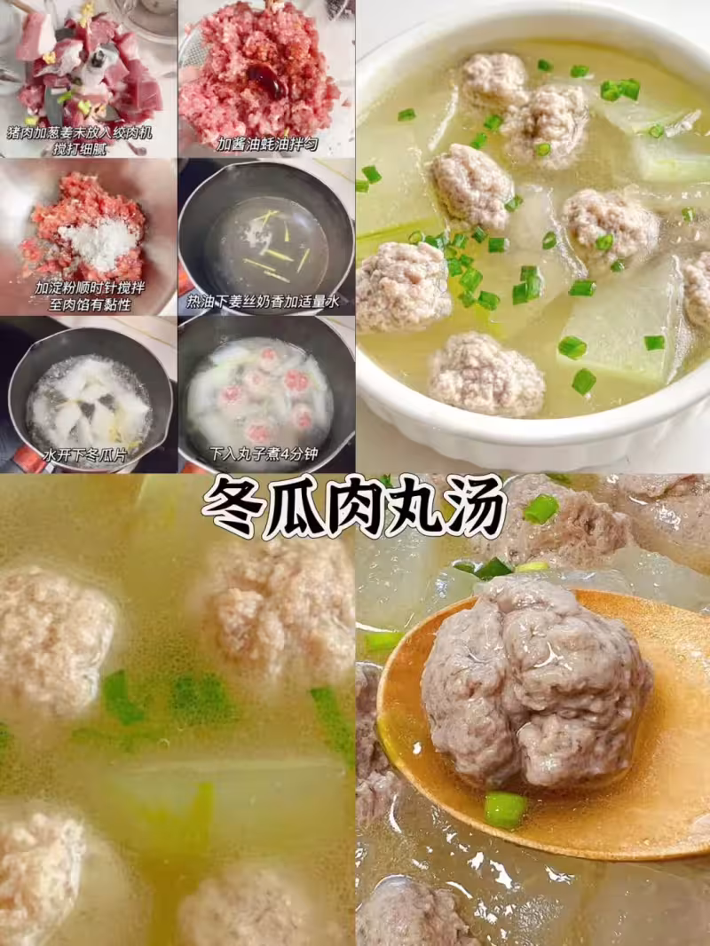 瘦肉剁碎,加薑末、澱粉攪勻成丸,下鍋配冬瓜片一起煮四分鐘。