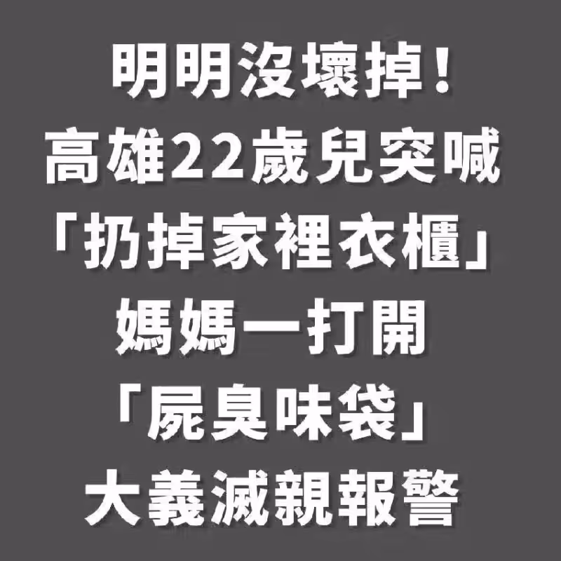 明明沒壞掉!高雄22歲兒突喊「扔掉家裡衣櫃...」,媽媽一打開「屍臭味袋」 大義滅親報警!