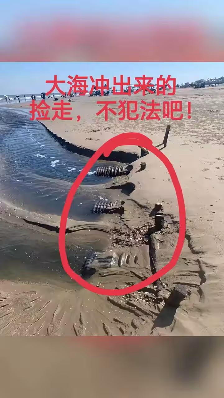 照片里,幾段灰色黑色的巨大管道橫陳在海灘與淺水交界處,被紅色時尚喚醒目地圈了出來。