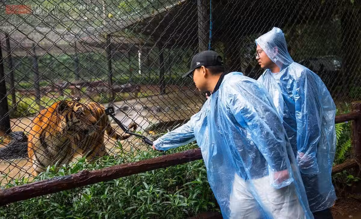 關在籠子也有好處,不但安全,遊客還可以近距離的欣賞和拍攝這些猛獸。看看這兩位自媒體人,如此近距離的拍攝,也真是太拼了,我真怕他的設備會被老虎叼走。