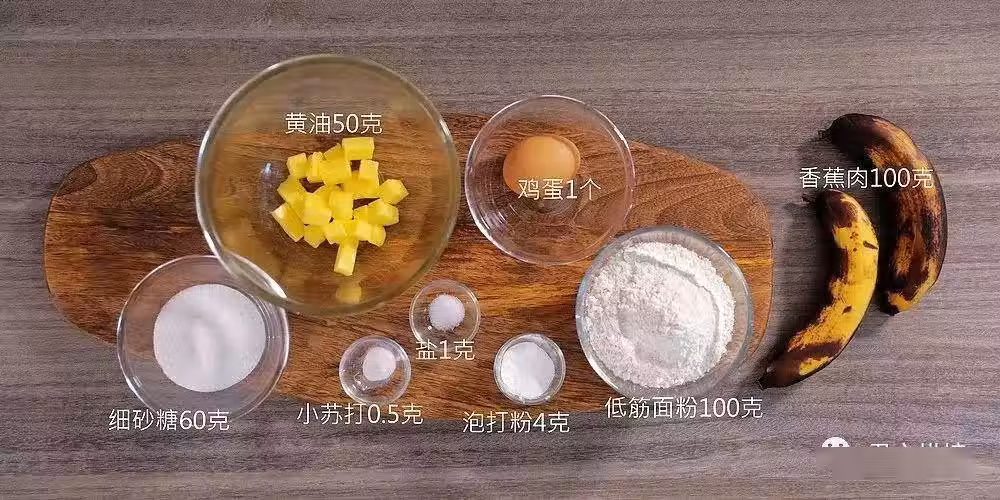 低筋麵粉100克,黃油50克,細砂糖60克,雞蛋1個,泡打粉4克,小蘇打0.5克,鹽1克,熟透的香蕉100克(純果肉)