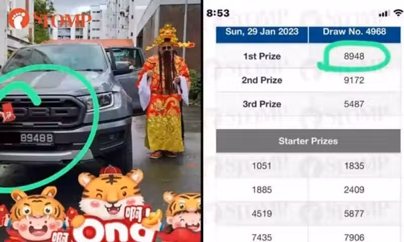 (新加坡31日訊)財神爺賜財!一名女子看見財神爺站在「招財車」旁,觸發靈感,花一新元(約3令吉30仙)下注轎車車牌號碼,年初八贏得萬字票頭獎!