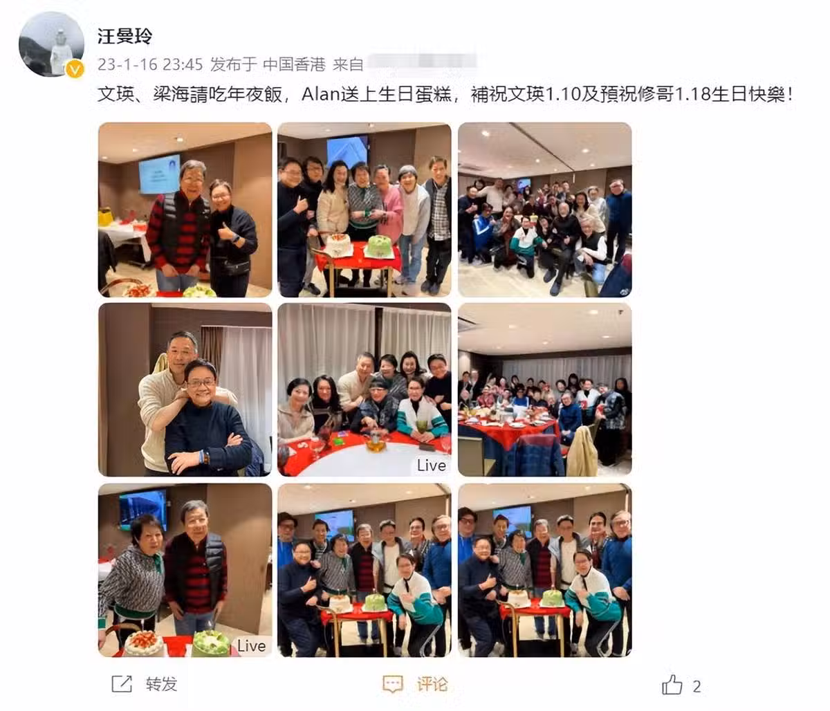 1月16日,資深傳媒人汪曼玲在個人社交賬號上曬出一組聚會照,並配文稱,文瑛、梁海請吃年夜飯,Alan送上生日蛋糕,補祝文瑛1.10及預祝修哥1.18生日快樂。