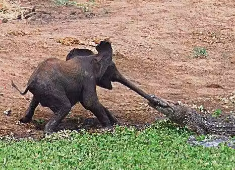 而一旁本來正在看小象練習喝水的大象媽媽看到小象被咬住了鼻子,就直接沖了上去,然後一腳踩在了鱷魚的背上,鱷魚瞬間就吃痛的鬆開了嘴,直接掉入了水中,而小象迅速的就跑到了媽媽的身後,兩隻象見鱷魚好像沒有了動靜。