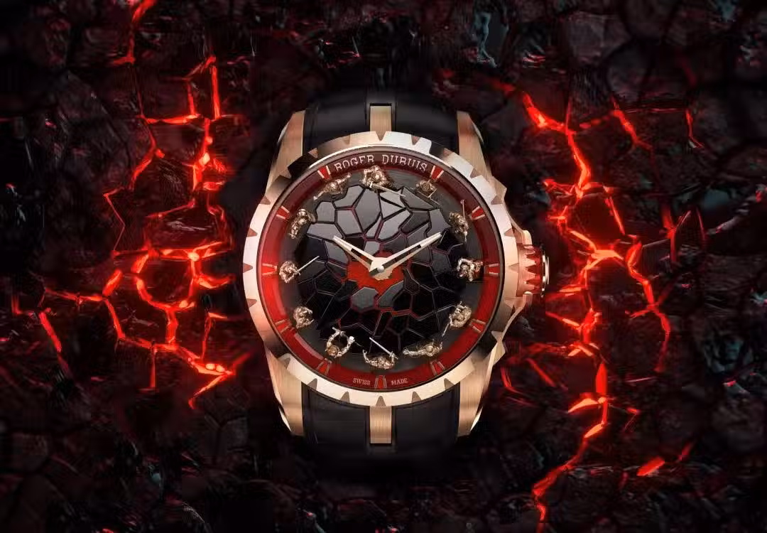 到2022年這種史詩感一下子就迸發出了前所未有的力量感,羅傑杜彼巧妙地用黑色穆拉諾玻璃為12名騎士搭建了一塊極具設計感和臨場感的場地,配合全新的12騎士微雕造型,展現了一場一觸即發的戰鬥場景,氣氛完美到位。這枚圓桌騎士完全延續了這個設計,只是把黑紅色的錶盤,替換為了綠色,減弱了一些緊張感,更多了一些平和。而且綠色穆拉諾玻璃對比之前的黑色版本顏色變化更加多樣,光照之下顏色也更加多變,再加上碎裂大地高低錯落,傾斜角度各異,盤面層次也極為豐富。