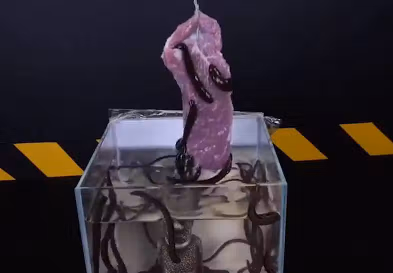 緊接著老外又找來了一個完整的豬頭,將豬頭扔進了水蛭缸中,在裡面有100條水蛭,老外為了激發水蛭的嗜血性,還特意將它們餓上了10天。