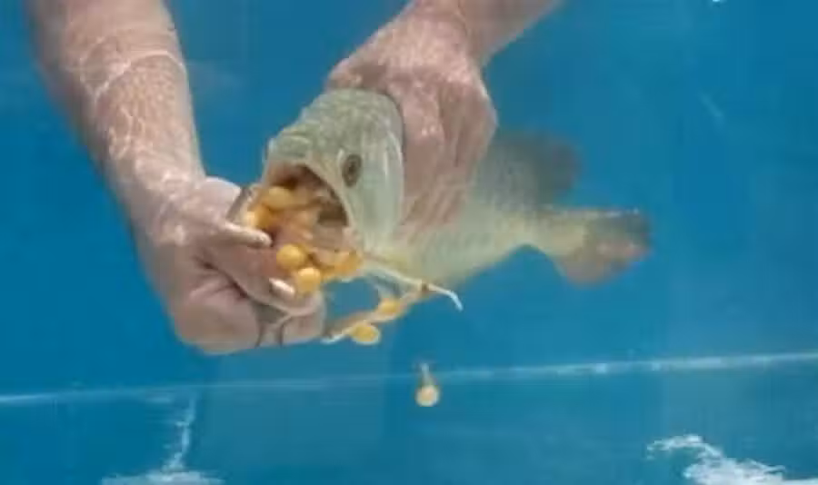 主人一臉茫然地杵在一旁,後來好友科普盲點,可能前主人飼養的兩條龍魚有過繁殖行為,自己買的這只金龍魚是雄性的,而雄性金龍魚在繁殖過程中,充當保姆工作,會把魚卵含在嘴裡,孵化魚苗。為了能順利完成孵化,過程中龍魚可以保持很多天不進食。