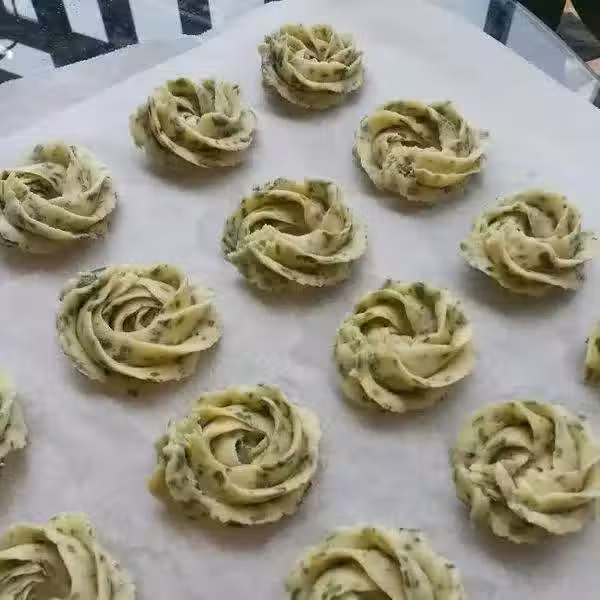 材料:黃油 140g、低筋麵粉 200g、牛奶 60g、糖粉 50g、鹽 5g、干蔥/海苔粉 10g