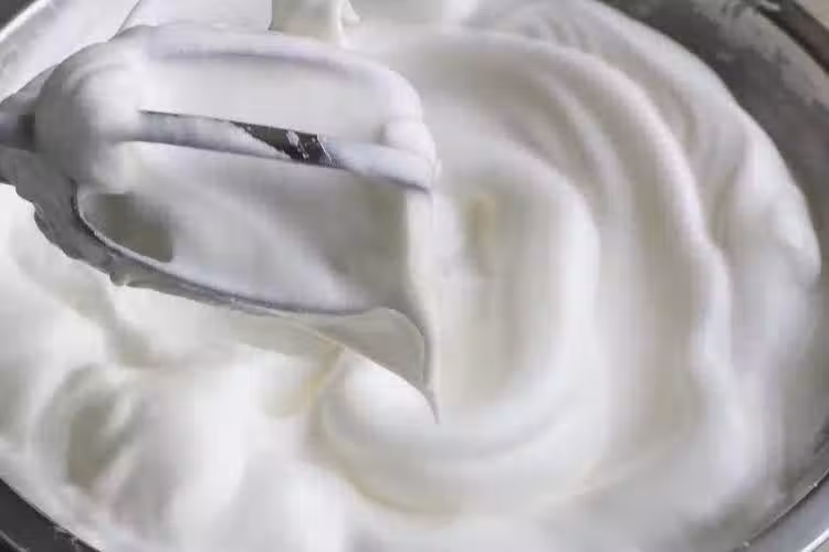 5、打好的蛋白先分1/3到蛋糊里翻拌均勻,這里一定是翻拌,不可畫圓,否則會導致消泡失敗;