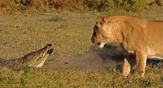 一隻鱷魚想要偷襲幼獅,遭獅群反擊,身體被掀翻成晚餐