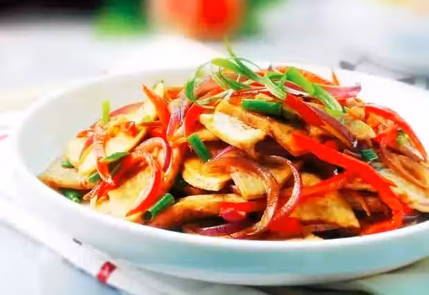 2、洋蔥切絲; 紅椒切絲; 蒜切碎; 姜切絲; 蔥切蔥花;