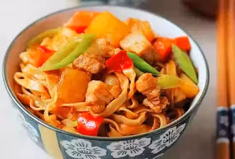 炒麵材料:自製寬面400克、五花肉100克、洋蔥1/4個、土豆1個、胡蘿蔔1/2個、青蒜1根、植物油1大勺、郫縣豆瓣醬2小勺、白糖1小勺、蚝油1小勺、鹽1/2小勺、香油幾滴。