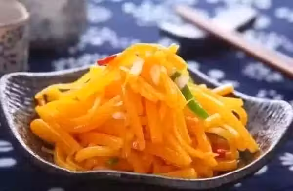 1、將嫩南瓜連皮洗凈,切細絲,攤在太陽下晾曬半天。