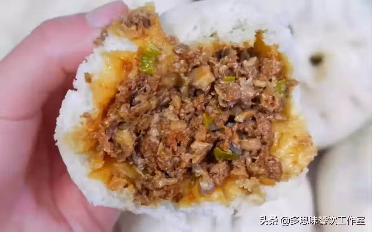 3取出麵糰揉光滑,搓成長條切成小劑子,撒乾粉壓扁擀成外圈薄中心厚的包子皮,放入餡料包起來