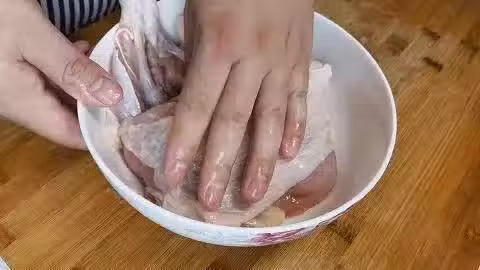 2.把處理好的雞腿放入一個盆中,加入小半勺的食鹽、小半勺胡椒粉、一勺料酒,抓拌按摩一會,然後醃制30分鐘,這樣雞肉才會更入味。