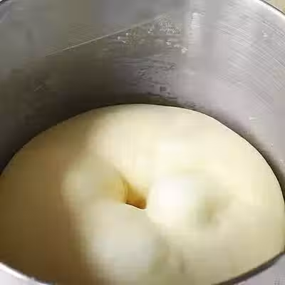 5、收圓放回攪拌缸內,蓋上保鮮膜放在溫暖的地方發酵。麵團發酵到1.5——2倍大,千萬別發酵過度。用手指粘上幹麵粉戳個洞,洞口不回縮不塌陷就發酵完成了。