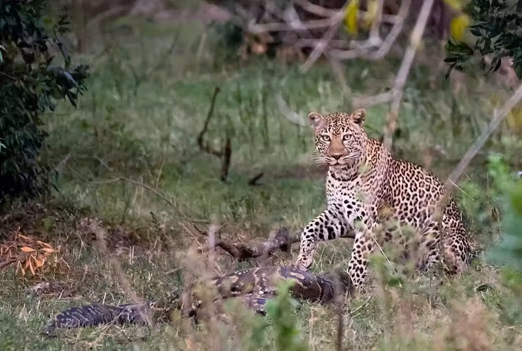 結局,巨蟒的腦袋被貫穿,沒多久就去世了。花豹同樣也受到了打擊,它的右前爪明顯受傷,它跛行著走進灌木林,看來花豹現在更需要的修養,而不是吃掉這條巨蟒。
