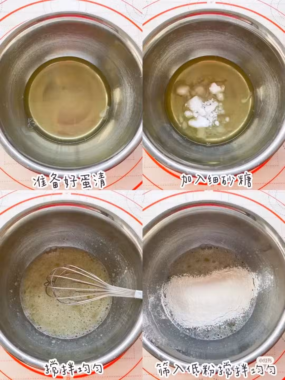 1.準備好90克雞蛋清,加入細砂糖攪拌均勻,篩入低筋麵粉拌勻,加入玉米油攪拌均勻