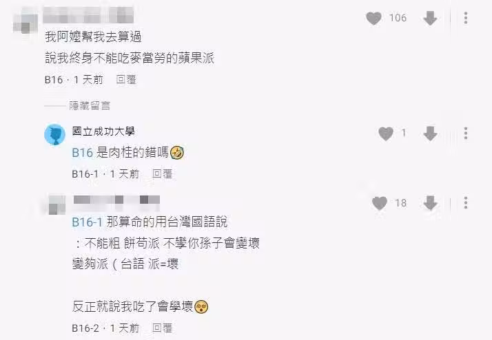此外,還有網友留言「我也是出生的時候算命說我有孔子命,這輩子會讀書有成就,如果吃了不該吃的就會破壞考試運」、「去算命,算命先生說我弟是某個神明的坐騎,跟牛有關,從那之後就沒再吃牛了」。