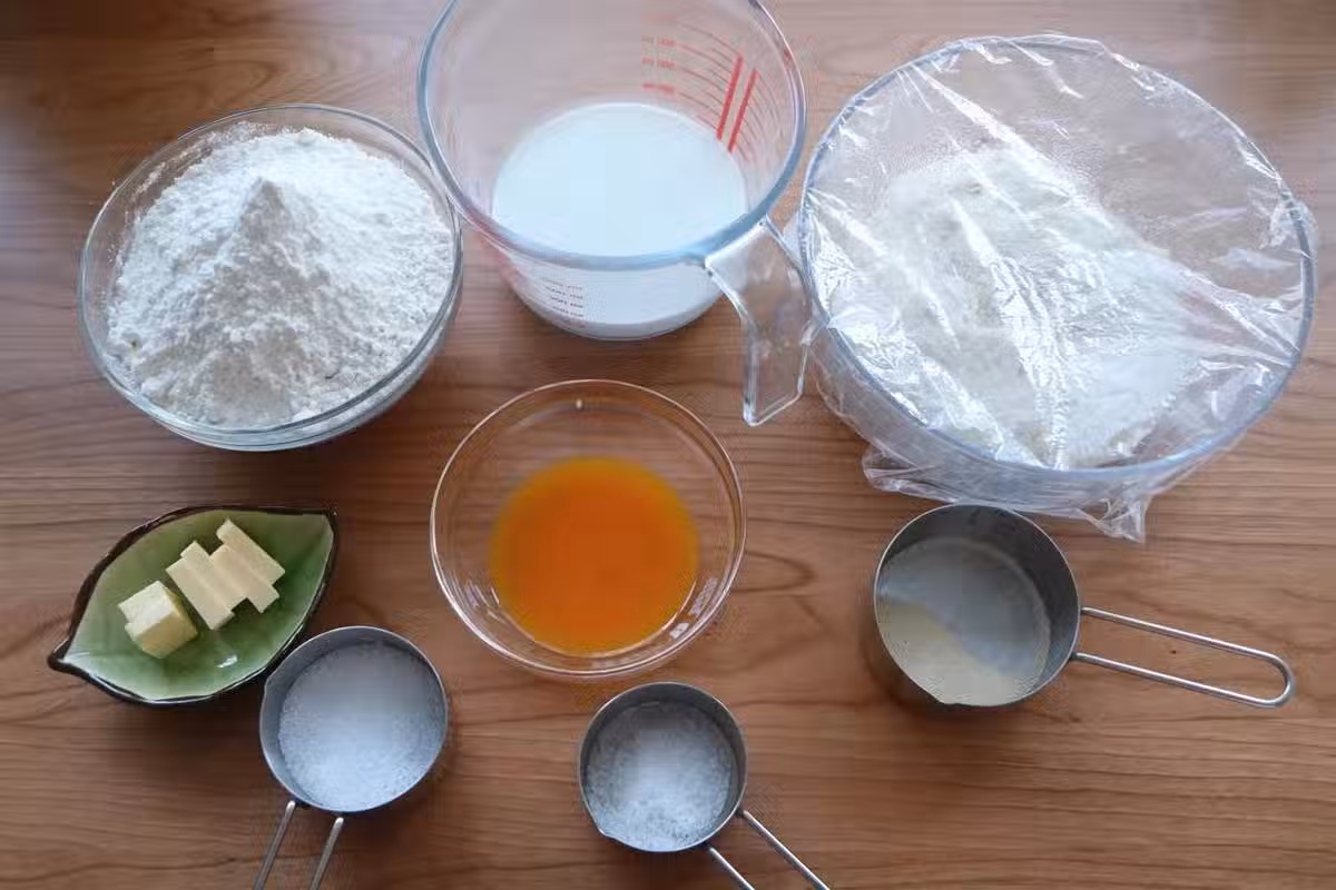 2、提前準備好的高筋麵粉和低筋麵粉混合加面桶裡面,再加入白糖、鹽,先拌均勻之後,再加入耐高糖酵母、全蛋液、牛奶(冰),提前做好的中種面團撕成小塊也一起加進去;