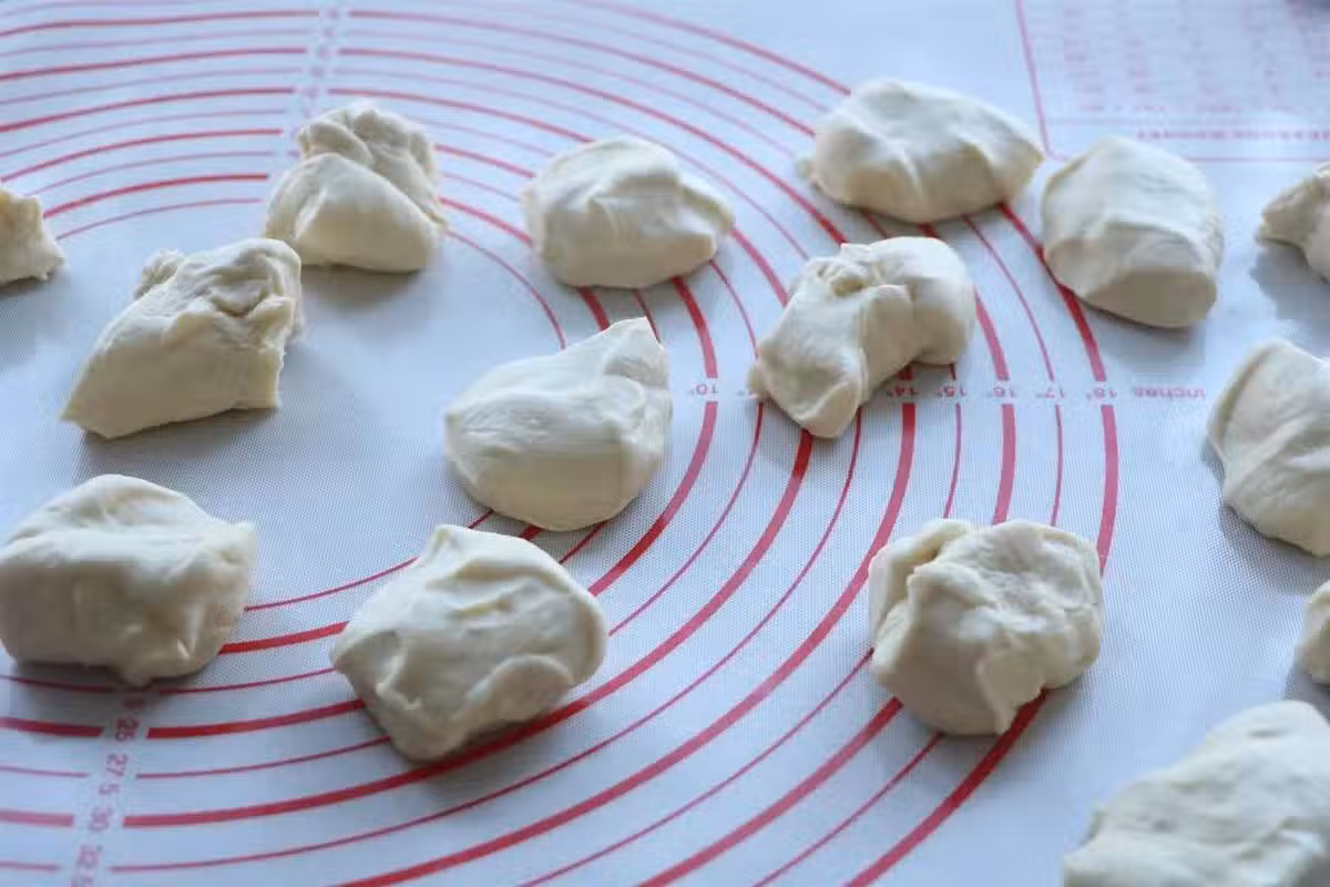 5、再把每個小面劑揉圓,取第一個揉好的,先搓長一點,再搓成水滴的形狀,擺放在烤盤上面,密封放在冰箱冷藏醒發40分鐘左右;