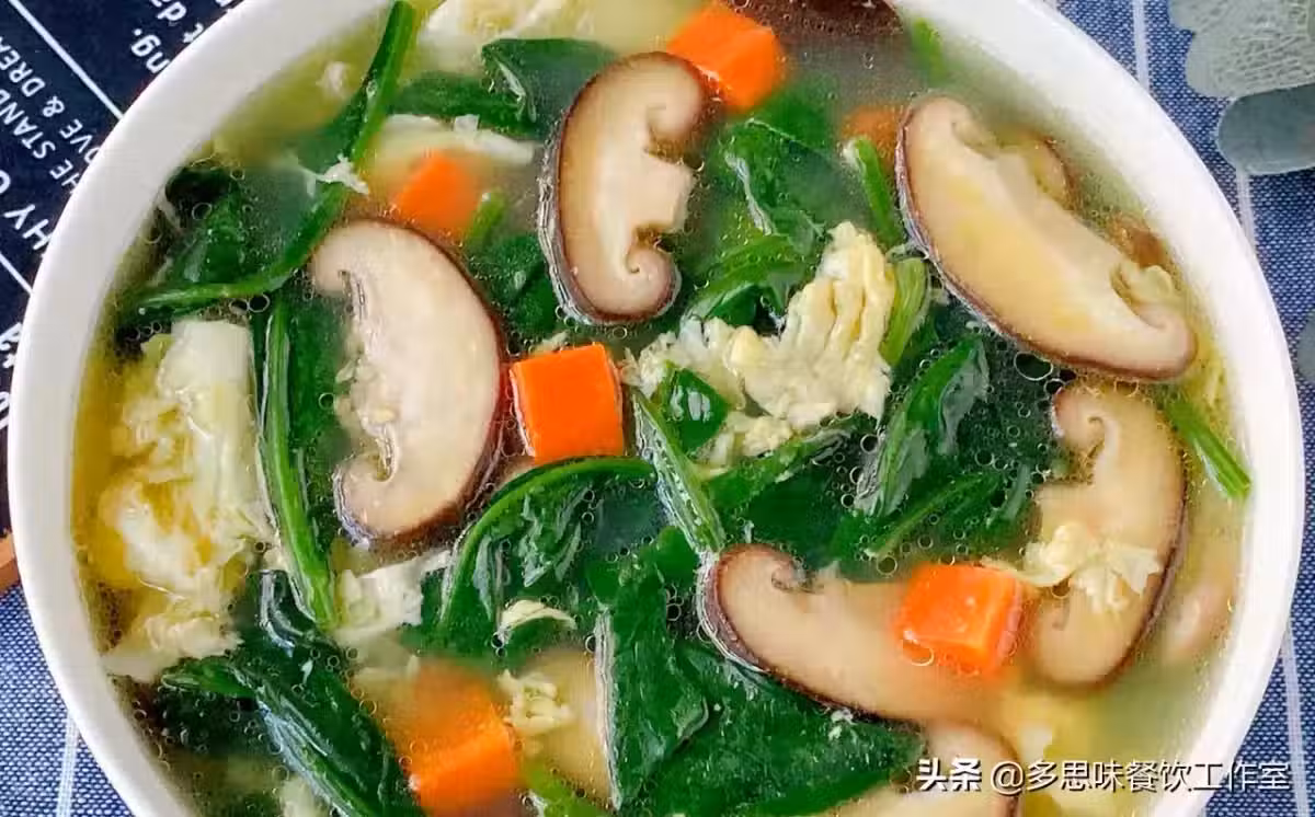2鍋加熱倒油炒香胡蘿蔔香菇炒軟,加兩碗水煮開菠菜煮軟,淋入雞蛋小鮮罐鮮菇雞精鹽調味煮1分鐘即可