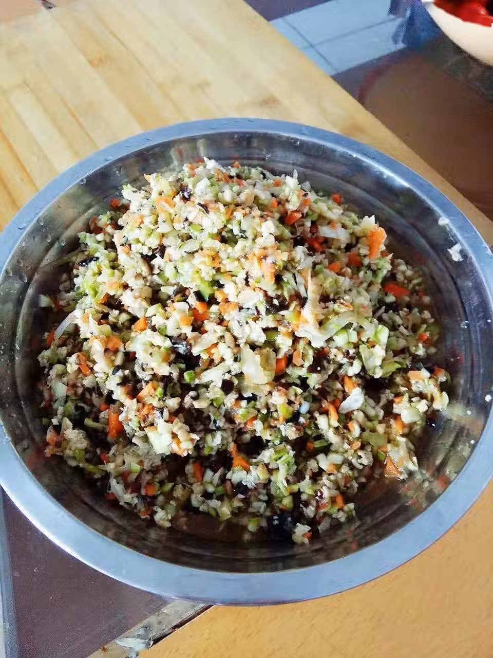 所有餡料混合在一起,加入植物油、味全高鮮(多加點)、素蠔油(餡就粘和到一起了)、少許醬油、花椒麵和一小勺鹽,調勻即可。