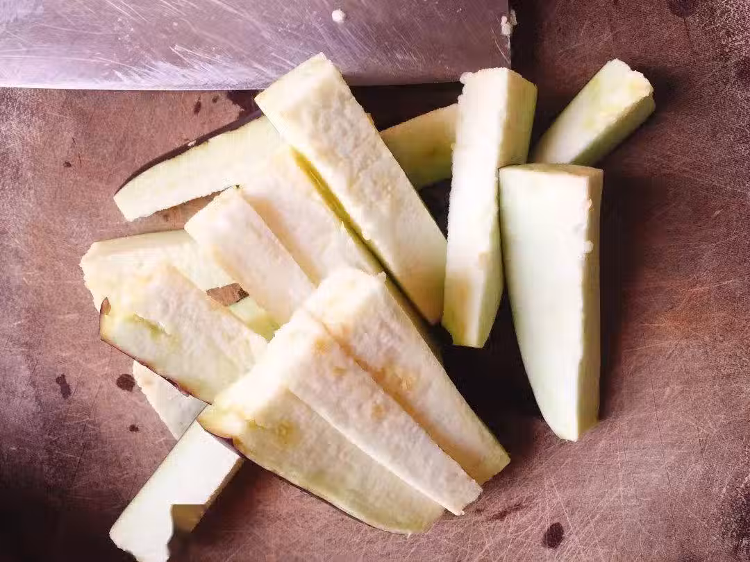 茄子洗凈切條,加鹽醃製10分鐘,再擠去醃製的水分,剁碎;