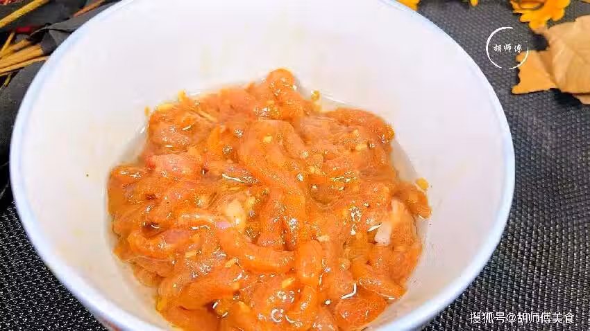 第二步:把瘦肉洗凈後切成細絲,然後將薑末、生抽、澱粉、黑胡椒粉、蠔油、食鹽全部放入到肉絲中攪拌均勻,接著淋上少許食用油,再次攪拌均勻即可。