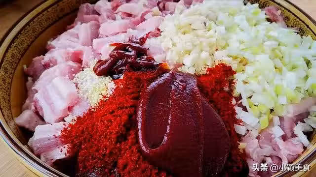 2. 切好之後裝入大碗中,放入蔥花、薑末、蒜末、一勺鹽,一勺雞精,兩勺蚝油,一勺辣椒粉,兩勺韓式辣醬