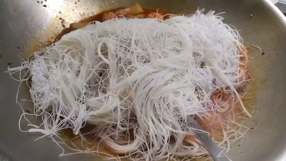 6)加入洋蔥頭和紅蘿蔔絲炒均。炒至米粉充分吸收調味汁,軟及干身。(不夠軟,可適量加水)