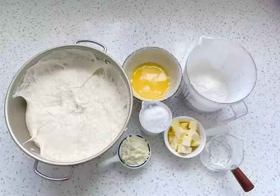 5、把中種麵團和主麵團的食材(除黃油外),全部放入廚師機桶裡。