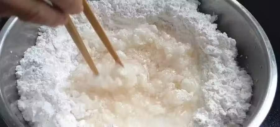 第八步:加的差不多了,就可以用手揉了,一定要小心一點,因為粉團還很燙的,把粉團揉得稍光滑就行,木薯粉不像麵粉和糯米粉,它是揉不到很光滑的