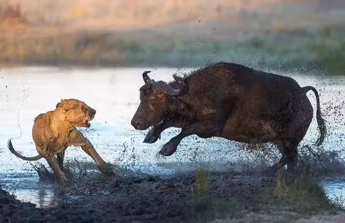 於是局面瞬間就逆轉了,老母獅由追逐小牛的獵手反過來變成了被母牛進攻的目標,如此近距離下母獅根本無從躲避,半秒之內母牛的牛角就頂了過來。