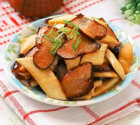杏鮑菇250g、臘肉200g、大蔥10g、生薑5g、大蒜5g、黃酒2大勺、白糖1小勺、生抽2小勺。