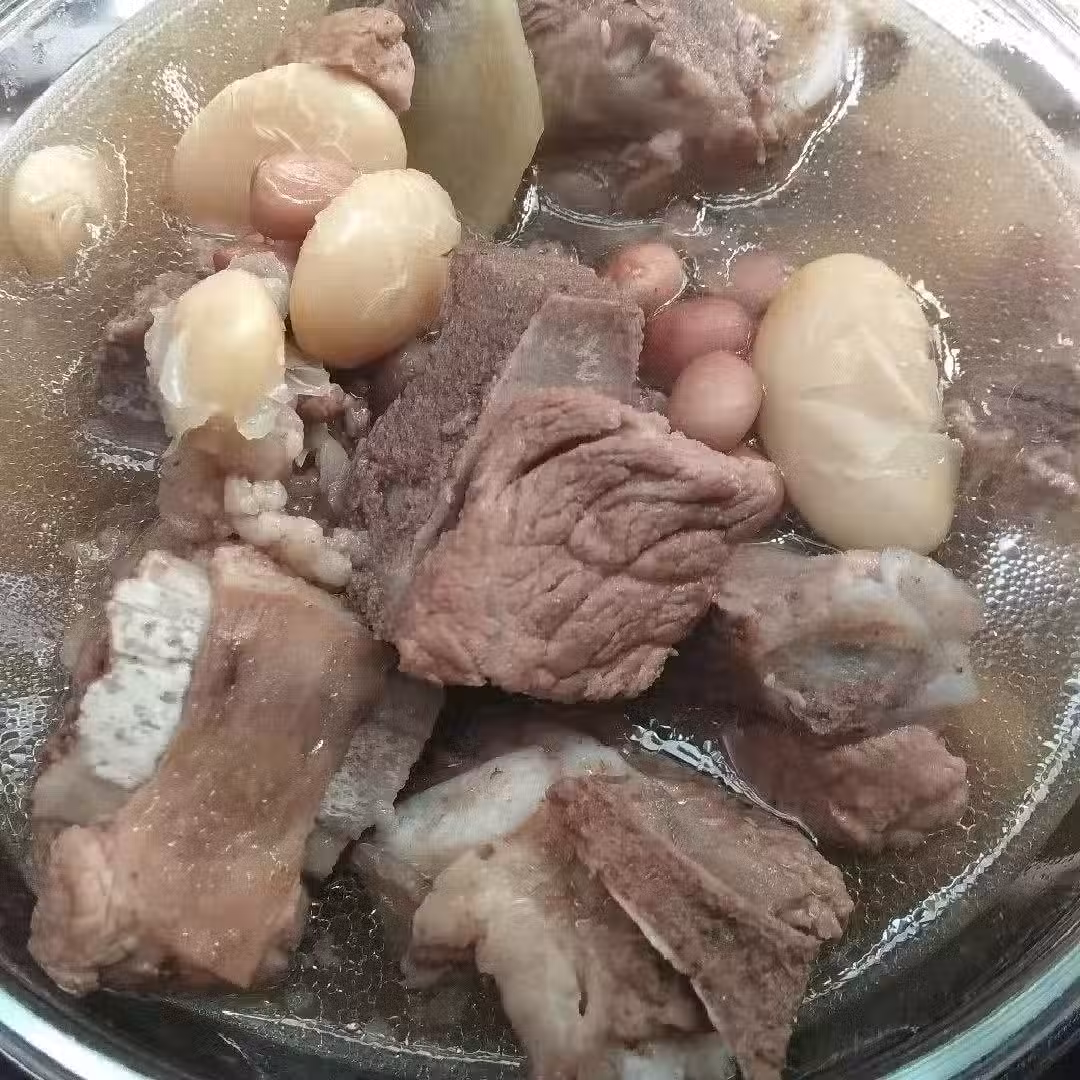 5、將煮好的花生米撈出瀝干水分,下入鍋中,大火煮開後小火繼續煮,大概煮至1小時左右,待肉酥爛,待湯汁濃稠,排骨酥爛,將鍋里的蔥段和薑片取出,以保證湯的清澈和口感。